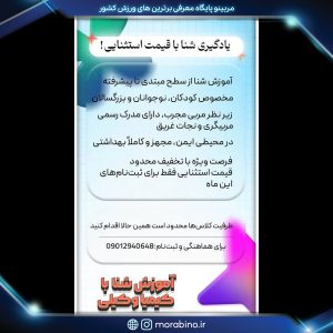 در سن ۱۸ سالگی، با شرکت در دوره مربیگری شنا و کسب نمره عالی، بهصورت رسمی وارد عرصه آموزش شنا شد ✅ سابقه درخشان در چندین مسابقه استانی شنا ✅ مربی رسمی شنا و نجات غریق با تجربه بالا ✅ آموزش در تمام روزهای هفته با زمانبندی و مکان انعطافپذیر ✅ فعالیت حرفهای در سطح استان اردبیل