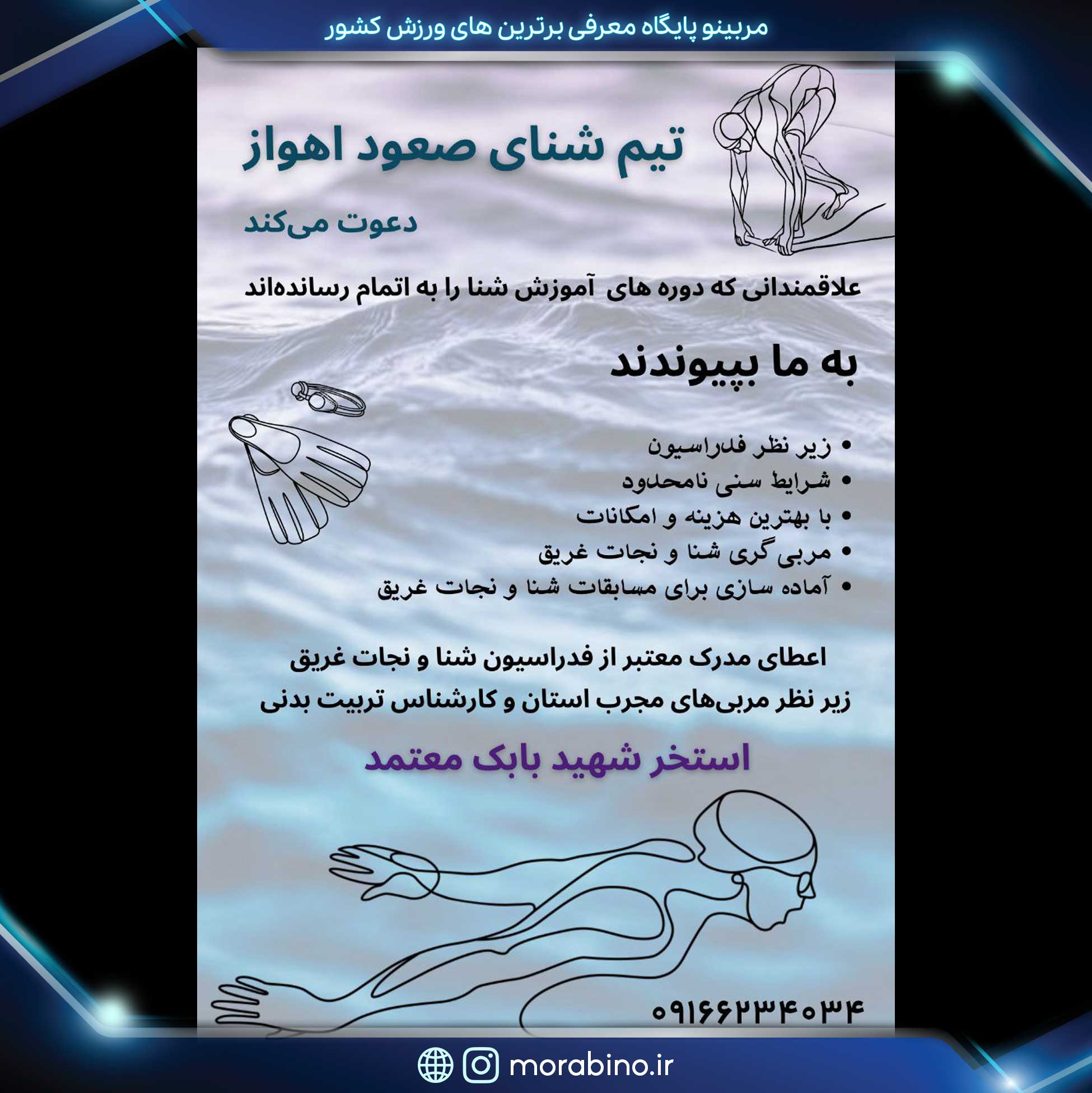 شما هم اگه تا دوره نیمه پیشرفته آموزش دیدی میتونید به تیم ایشون با نام رسمی تیم شنا صعود اهواز ملحق بشید و قهرمان بشید.
